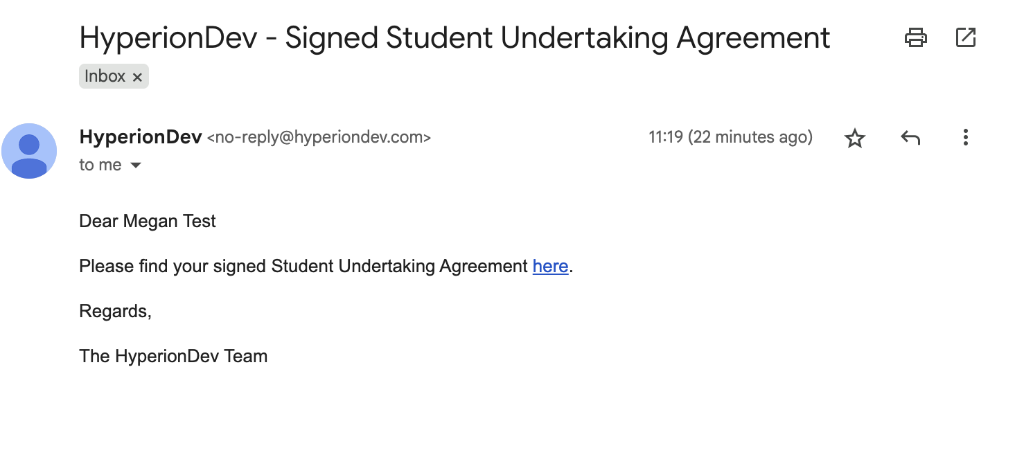 - You will also receive an email with a copy of your signed Student Undertaking agreement.