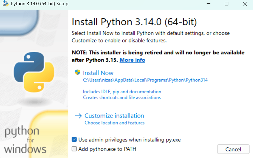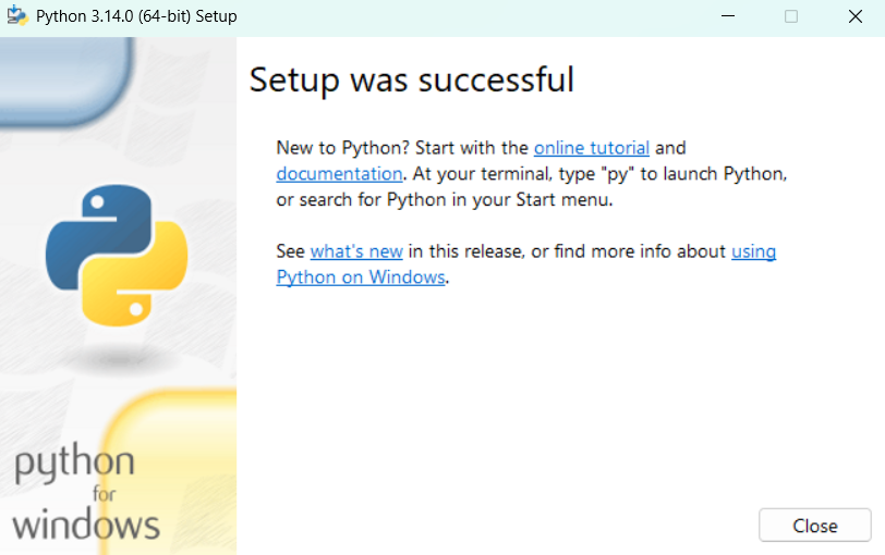 You will be met with this installer, very important that the tickbox for “Add python.exe to PATH” is ticked off. Then we can simply click the Install now button, let the installer run and the installation should be successful and you will be met with the following :
