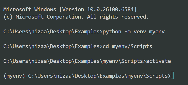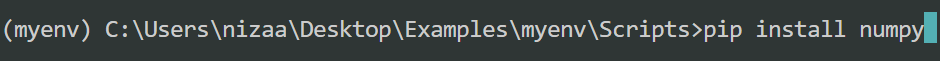 Then we path into the new file called myenv and then into a subfolder called Scripts. At this point we should be ready to activate our virtual environment, we then finally enter activate to activate the env. To confirm that all of this worked, you should see in your terminal, encaused in brackets the name of your virtual environment.